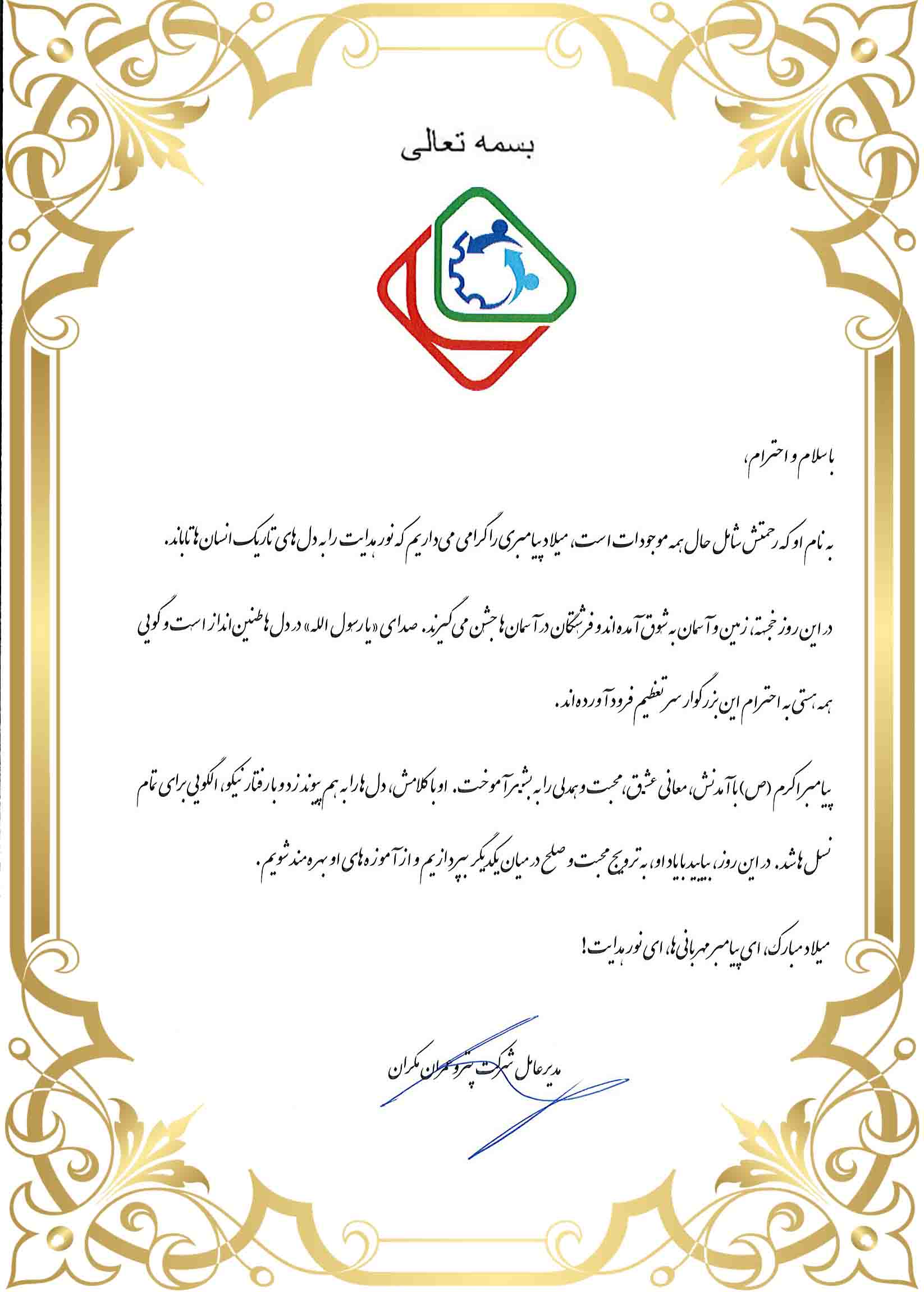 با سلام و احترام، به نام او که رحمتش شامل حال همه موجودات است، میلاد پیامبری را گرامی می‌داریم که نور هدایت را به دل‌های تاریک انسان‌ها تاباند. در این روز خجسته، زمین و آسمان به شوق آمده‌اند و فرشتگان در آسمان‌ها جشن می‌گیرند. صدای «یا رسول الله» در دل‌ها طنین‌انداز است و گویی همه هستی به احترام این بزرگوار سر تعظیم فرود آورده‌اند. پیامبر اکرم (ص) با آمدنش، معانی عشق، محبت و همدلی را به بشر آموخت. او با کلامش، دل‌ها را به هم پیوند زد و با رفتار نیکو، الگویی برای تمام نسل‌ها شد. در این روز، بیایید با یاد او، به ترویج محبت و صلح در میان یکدیگر بپردازیم و از آموزه‌های او بهره‌مند شویم. میلاد مبارک، ای پیامبر مهربانی‌ها، ای نور هدایت! مدیرعامل شرکت پتروعمران مکران